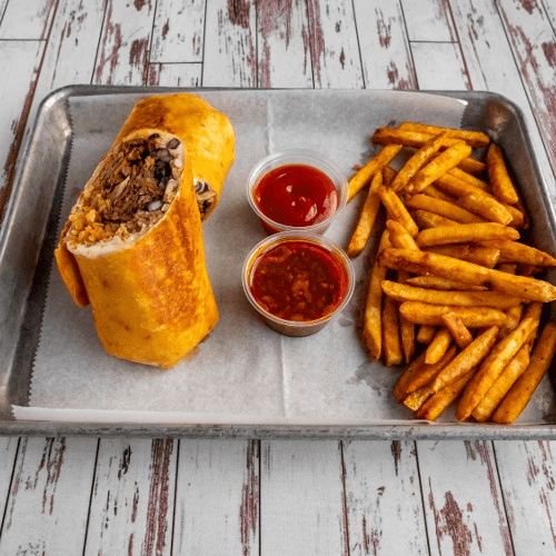 A large crisp flour tortilla filled with cheese, rice, beans and your choice of meat. Served with a side of fries.