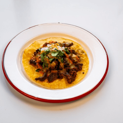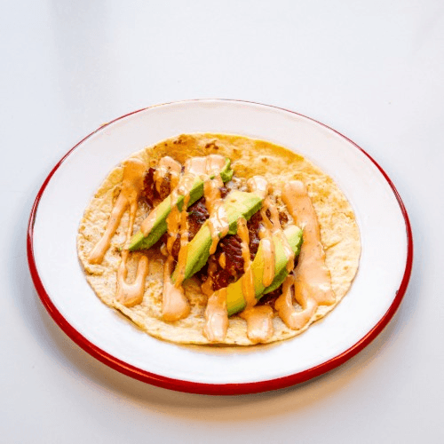 Steak-vegan cheese in a GF flour tortilla filled with your choice of vegan meat and sweet yellow corn, spinach, mushrooms topped with pico and pickled red onions.