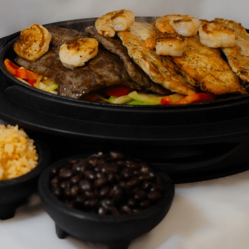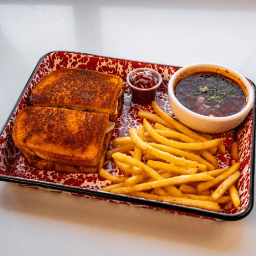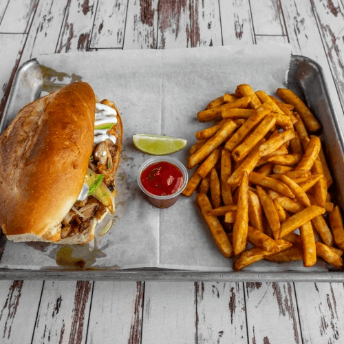 A buttered telera bread filled with refried beans, grilled cheese, grilled onions, sour cream, avocado slices & your choice of meat served with fries.