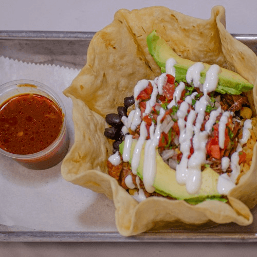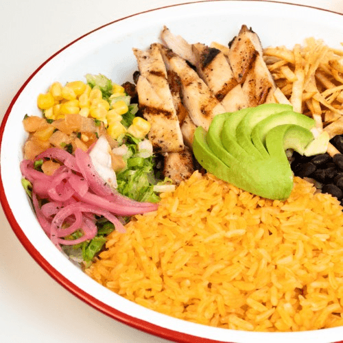 A bowl filled with rice, beans, corn with your choice of meat topped with avocado, sour cream & pico.