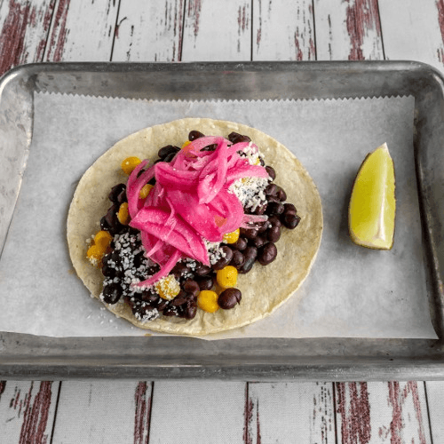 Whole black beans served in a GF corn, flour tortilla topped with corn & pickled onions.