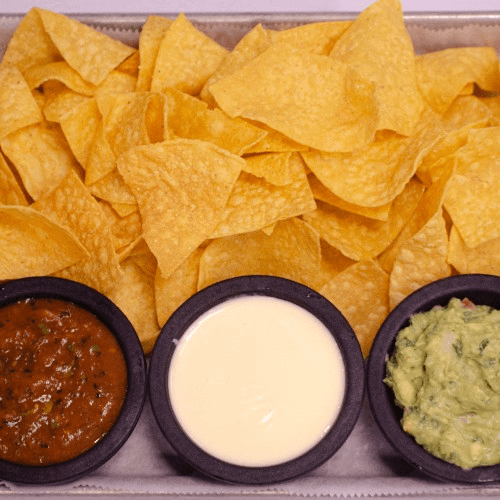 A mix of three favorites cheese dip, salsa and guacamole with bottomless chips.
