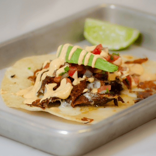 A large crisp flour tortilla filled with cheese and your choice of meat. Drizzled with avocado sauce & sour cream topped with pico served with a side of rice & beans.
