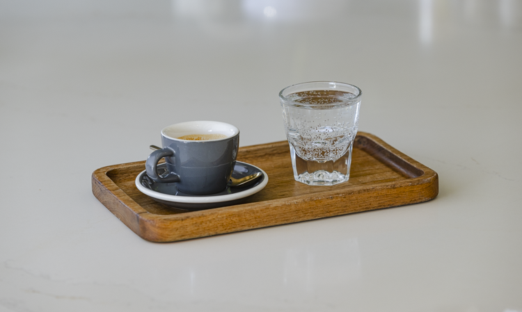 Freshly pulled (Synastry) espresso served with short side of mineral water.