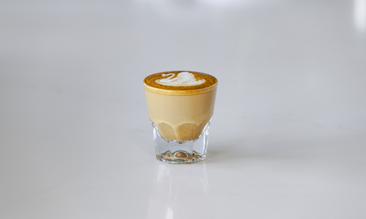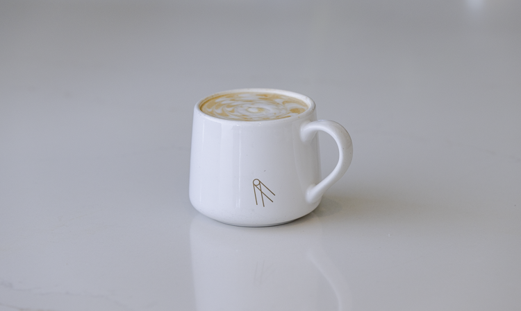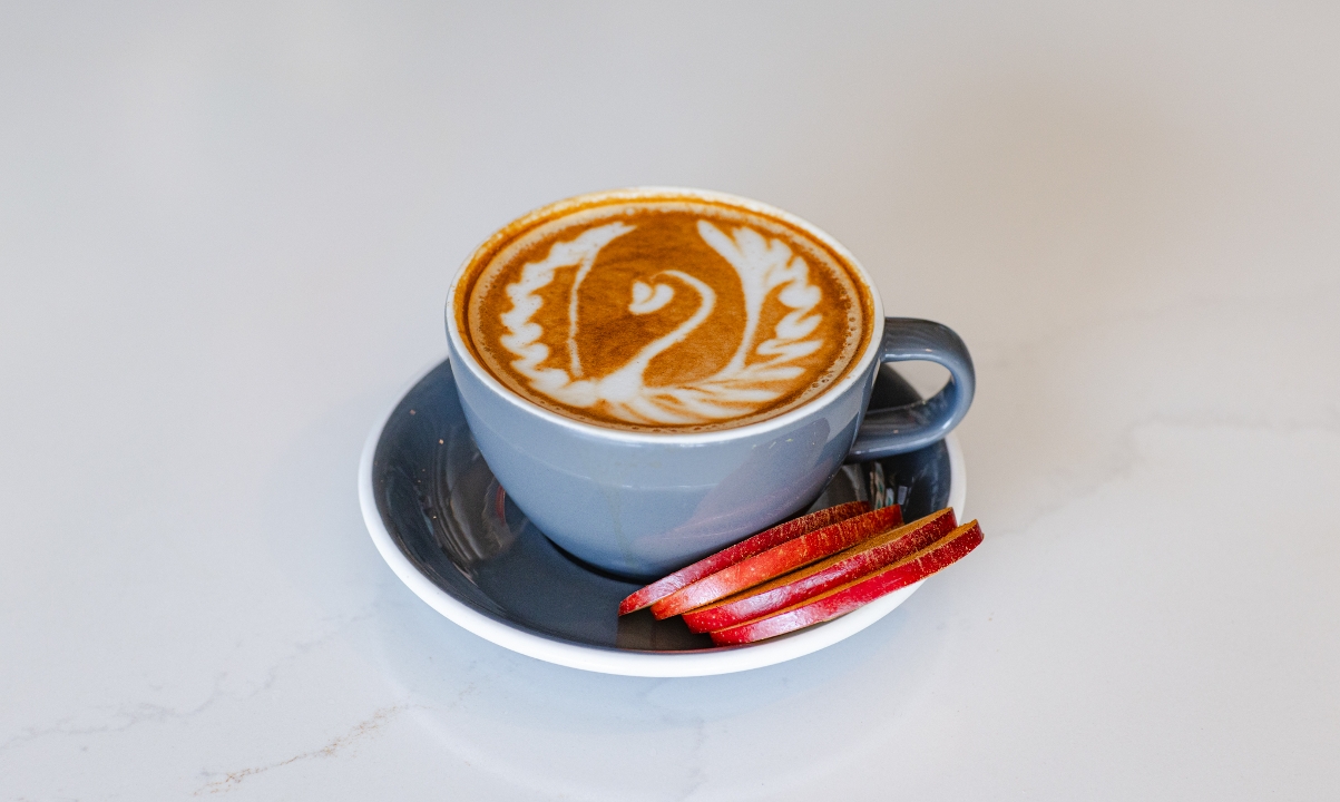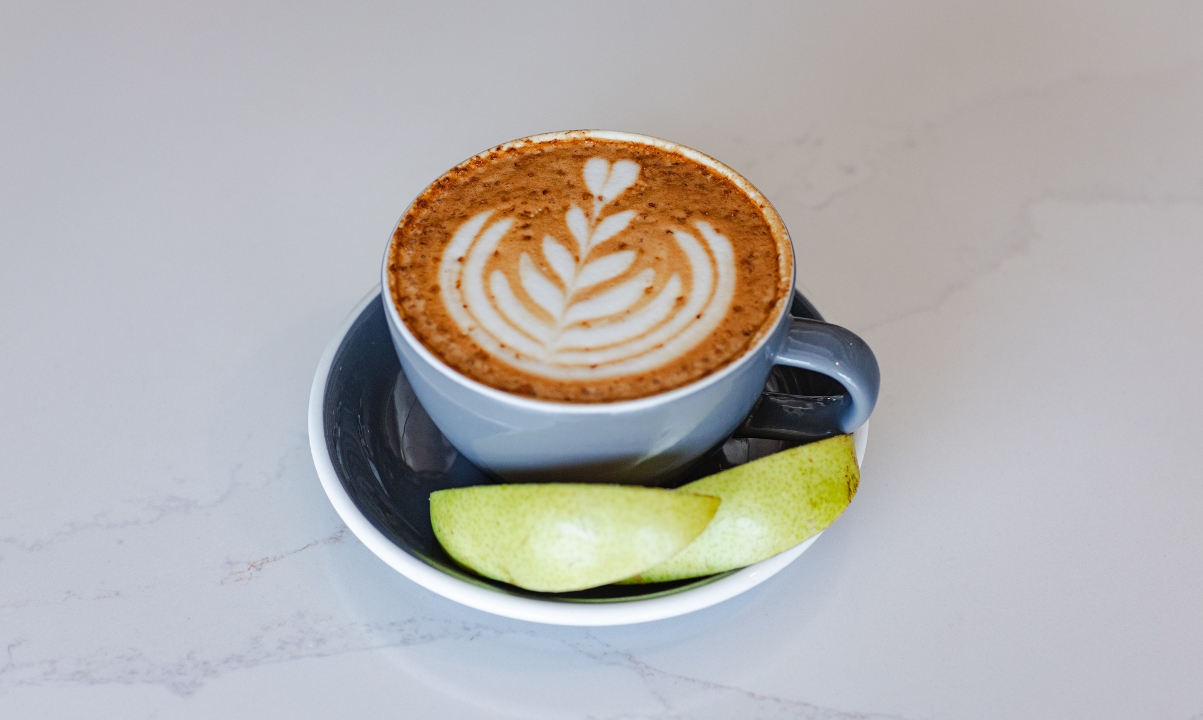 Oat milk latte with roasted pear, cardamom, and ginger.